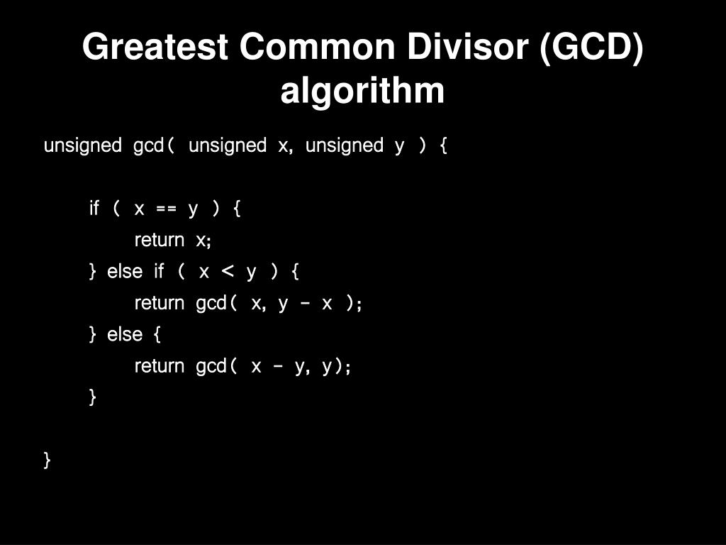 Greatest Common Divisor (GCD) algorithm unsigned gcd( unsigned x, unsigned y ) { if ( x == y ) { return x; } else if ( x < y ) { return gcd( x, y - x ); } else { return gcd( x - y, y); } }
