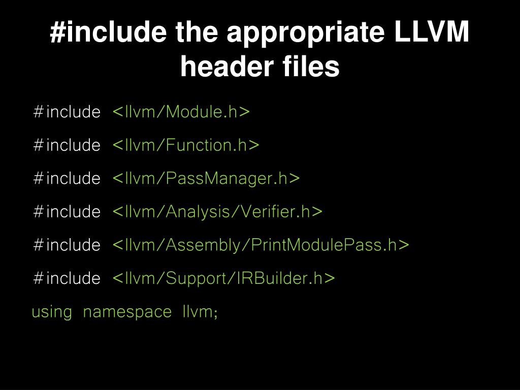 #include the appropriate LLVM header files #include <llvm/Module.h> #include <llvm/Function.h> #include <llvm/PassManager.h> #include <llvm/Analysis/Verifier.h> #include <llvm/Assembly/PrintModulePass.h> #include <llvm/Support/IRBuilder.h> using namespace llvm;