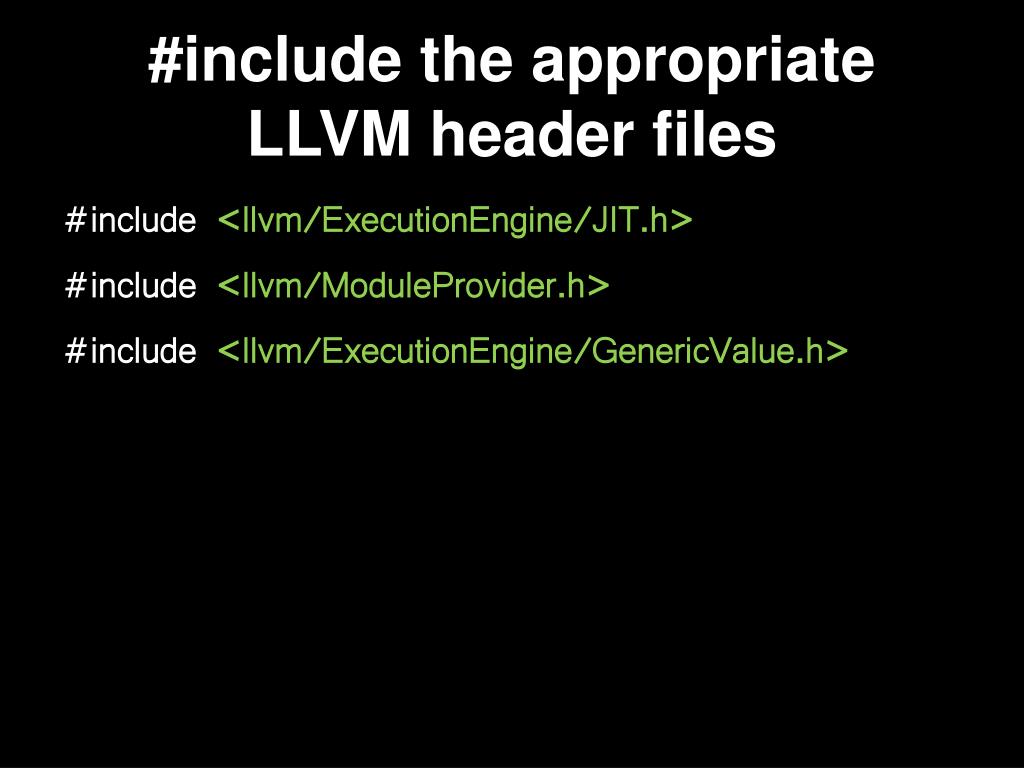 #include the appropriate LLVM header files #include <llvm/ExecutionEngine/JIT.h> #include <llvm/ModuleProvider.h> #include <llvm/ExecutionEngine/GenericValue.h>