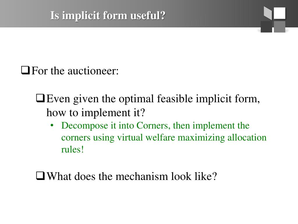 Is implicit form useful? • For the auctioneer: • Even given the optimal feasible implicit form, how to implement it? • Decompose it into Corners,thenimplementthecornersusingvirtualwelfaremaximizingallocationrules! • What does the mechanism look like?