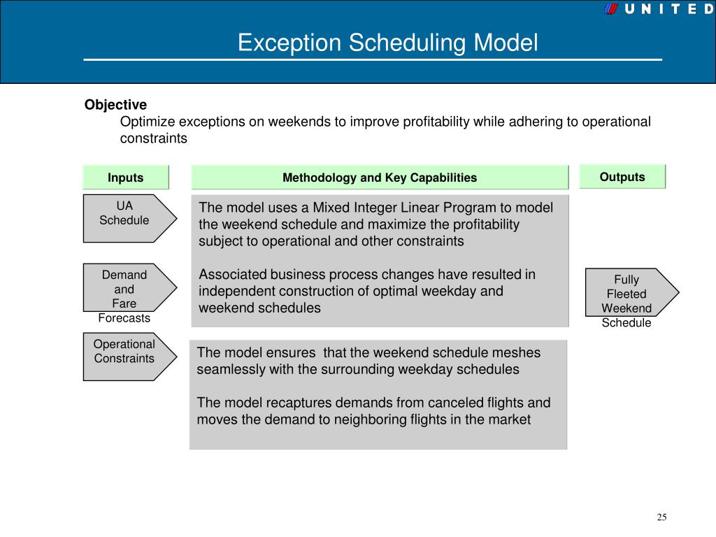 Exception Scheduling Model • Objective • Optimize exceptions on weekends to improve profitability while adhering to operational constraints Outputs Inputs Methodology and Key Capabilities UA Schedule The model uses a Mixed Integer Linear Program to model the weekend schedule and maximize the profitability subject to operational and other constraints Associated business process changes have resulted in independent construction of optimal weekday and weekend schedules Demand and Fare Forecasts Fully Fleeted Weekend Schedule Operational Constraints The model ensures that the weekend schedule meshes seamlessly with the surrounding weekday schedules The model recaptures demands from canceled flights and moves the demand to neighboring flights in the market
