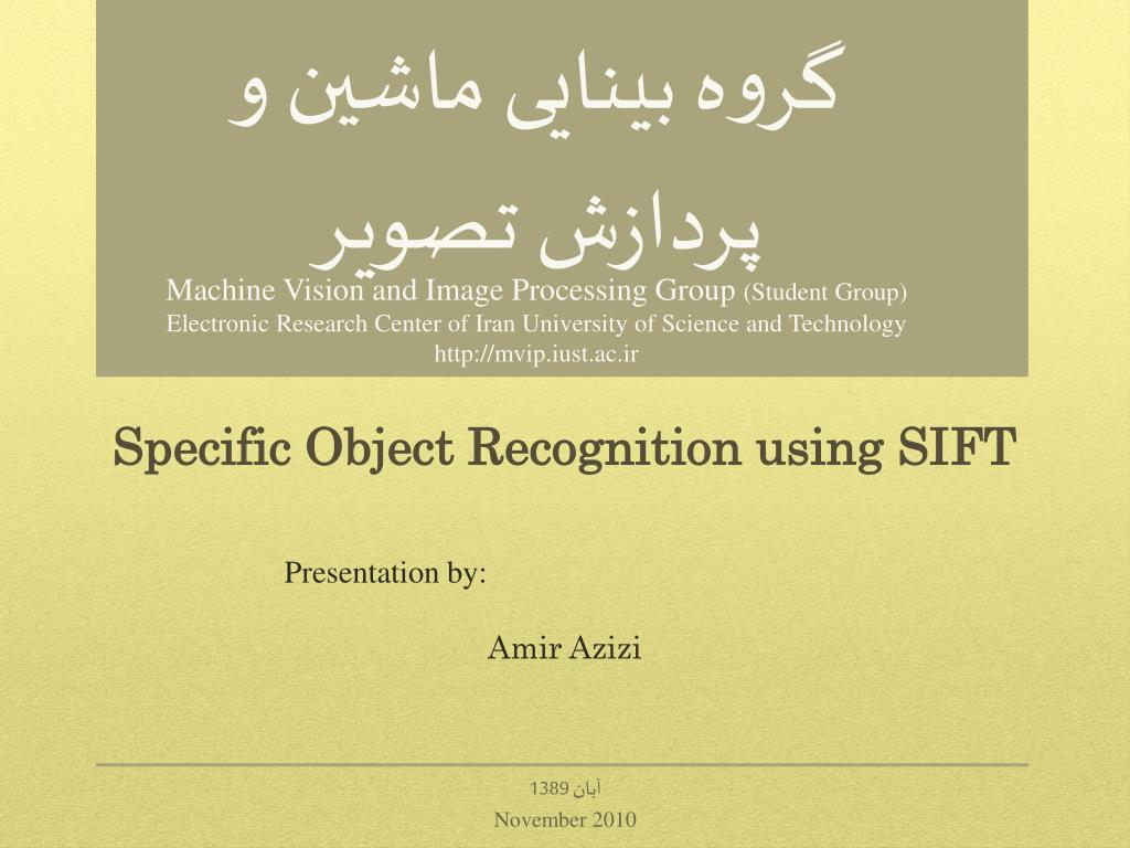 Machine Vision and Image Processing Group (Student Group) Electronic Research Center of Iran University of Science and Technology http://mvip.iust.ac.ir. Specific Object Recognition using SIFT. Presentation by: Amir Azizi. گروه بینایی ماشین و پردازش تصویر. آبان 1389 November 2010.