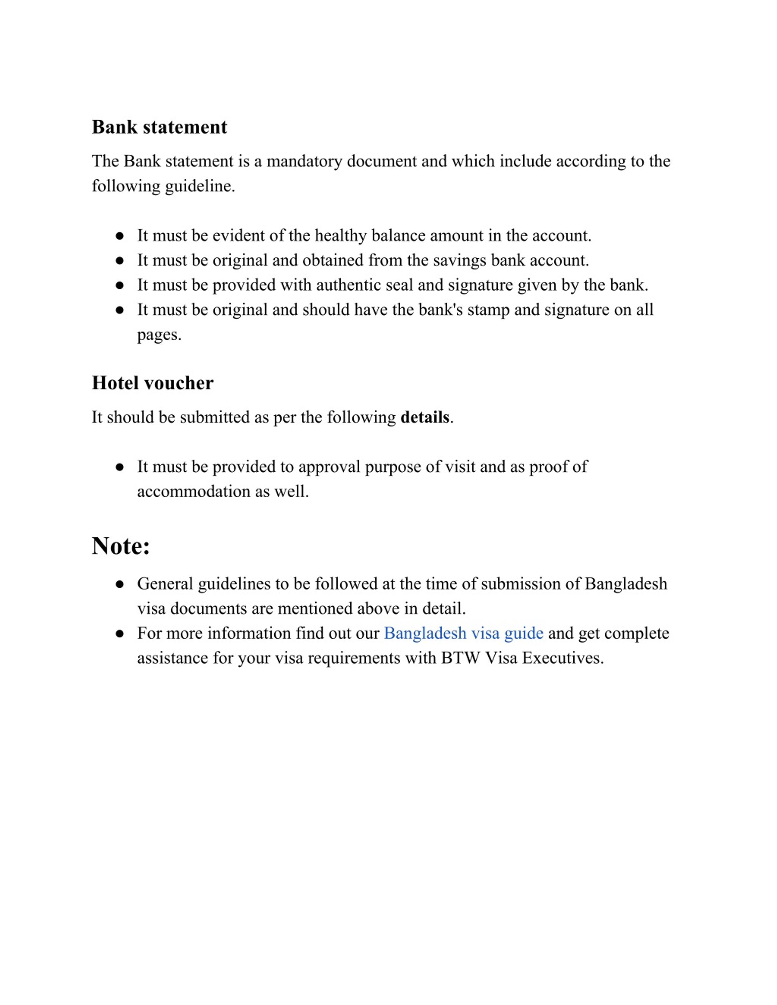 Bank statement The Bank statement is a mandatory document and whichinclude according to the following guideline. ● It must be evident of the healthy balance amount in the account. ● It must be original and obtained from the savings bank account. ● It must be provided with authentic seal and signature given by the bank. ● It must be original and should have the bank's stamp and signature on all pages. Hotel voucher It should be submitted as per the following details. ● It must be provided to approval purpose of visit and as proof of accommodation as well. Note: ● General guidelines to be followed at the time of submission of Bangladesh visa documents are mentioned above in detail. ● For more information find out our Bangladesh visa guide and get complete assistance for your visa requirements with BTW Visa Executives.
