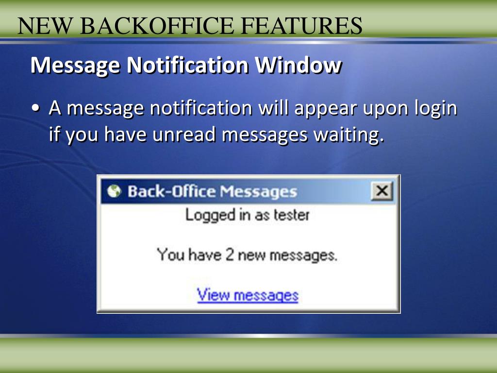 Message Notification Window A message notification will appear upon login if you have unread messages waiting. NEW BACKOFFICE FEATURES