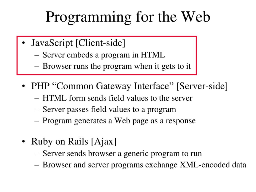 Programming for the Web • JavaScript [Client-side] • Server embeds a program in HTML • Browser runs the program when it gets to it • PHP “Common Gateway Interface” [Server-side] • HTML form sends field values to the server • Server passes field values to a program • Program generates a Web page as a response • Ruby on Rails [Ajax] • Server sends browser a generic program to run • Browser and server programs exchange XML-encoded data