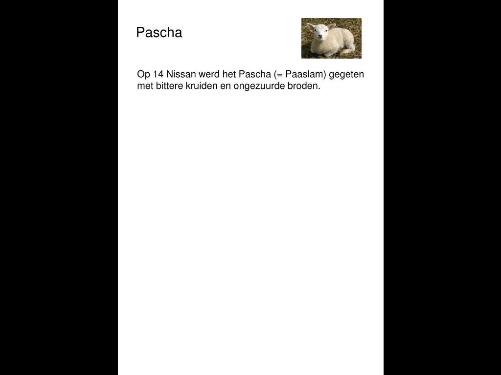 Pascha Op 14 Nissan werd het Pascha (= Paaslam) gegeten met bittere kruiden en ongezuurde broden.