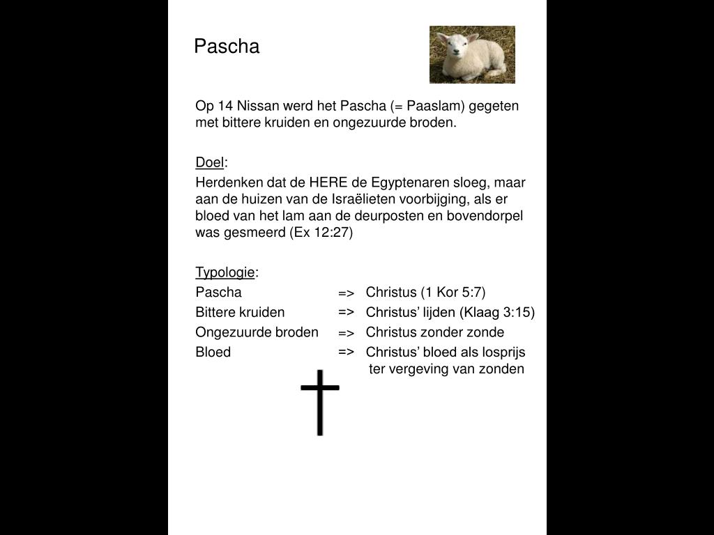 Pascha Op 14 Nissan werd het Pascha (= Paaslam) gegeten met bittere kruiden en ongezuurde broden. Doel: Herdenken dat de HERE de Egyptenaren sloeg, maar aan de huizen van de Israëlieten voorbijging, als er bloed van het lam aan de deurposten en bovendorpel was gesmeerd (Ex 12:27) Typologie: Pascha => Christus (1 Kor 5:7) Bittere kruiden => Christus’ lijden (Klaag 3:15) Ongezuurde broden => Christus zonder zonde Bloed => Christus’ bloed als losprijs ter vergeving van zonden