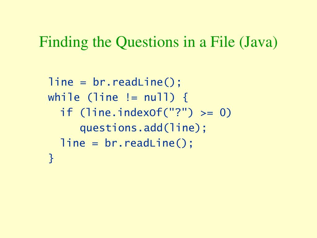Finding the Questions in a File (Java) line = br.readLine(); while (line != null) { if (line.indexOf("?") >= 0) questions.add(line); line = br.readLine(); }