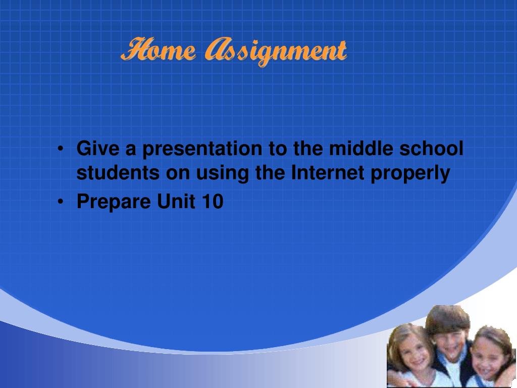 Home Assignment Give a presentation to the middle school students on using the Internet properly Prepare Unit 10