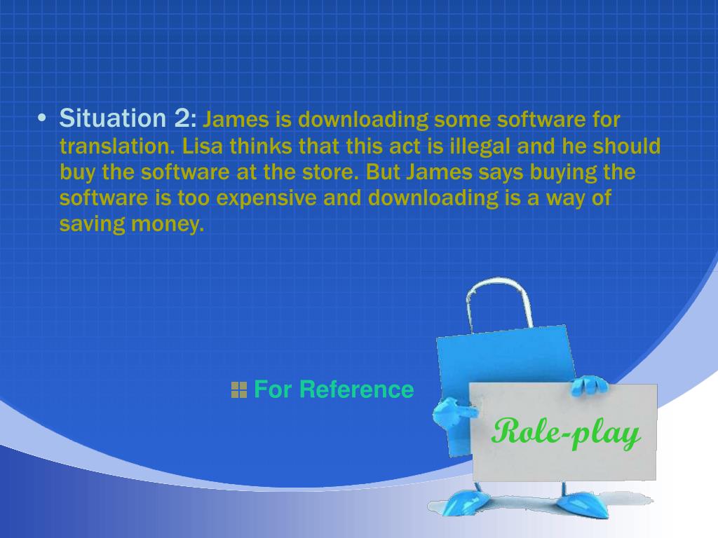 Role-play • Situation 2:James is downloading some software for translation. Lisa thinks that this act is illegal and he should buy the software at the store. But James says buying the software is too expensive and downloading is a way of saving money. • For Reference