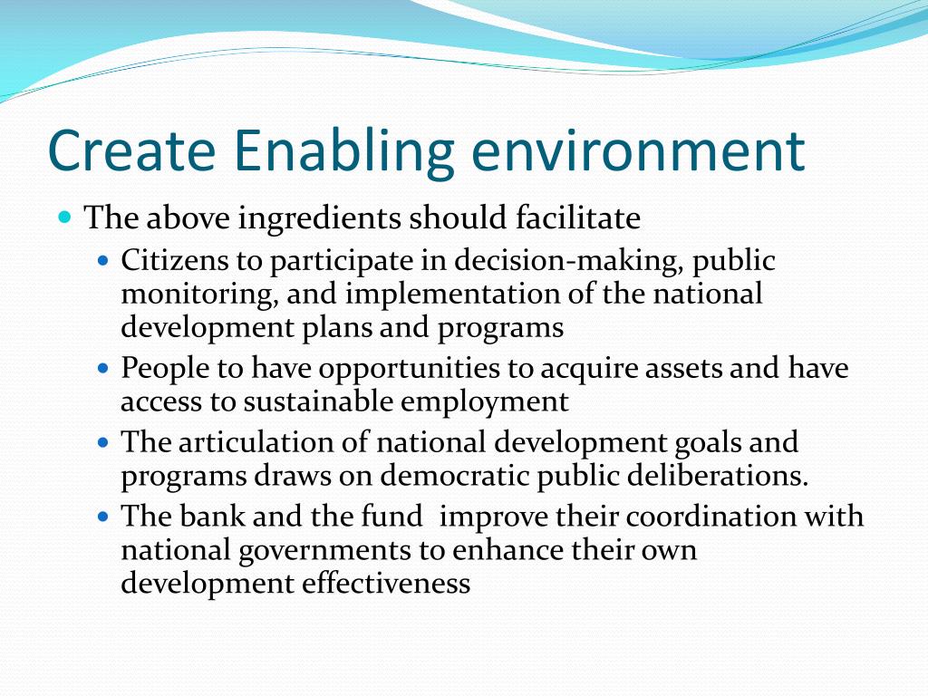 Create Enabling environment • The above ingredients should facilitate • Citizens to participate in decision-making, public monitoring, and implementation of the national development plans and programs • People to have opportunities to acquire assets and have access to sustainable employment • The articulation of national development goals and programs draws on democratic public deliberations. • The bank and the fund improve their coordination with national governments to enhance their own development effectiveness