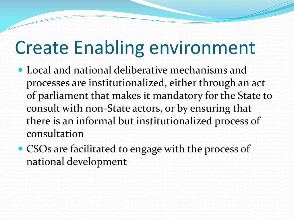 Create Enabling environment • Local and national deliberative mechanisms and processes are institutionalized, either through an act of parliament that makes it mandatory for the State to consult with non-State actors, or by ensuring that there is an informal but institutionalized process of consultation • CSOs are facilitated to engage with the process of national development
