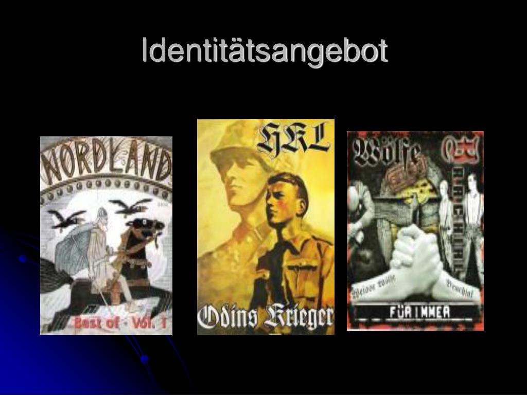 Rechtsextreme MusikBedeutung ‚Einstiegsdroge‘ und integratives Element der rechtsextremen Szene Indentitätsangebot Prägung und Verfestigung von Feindbildern Gewalt-motivierende Wirkung