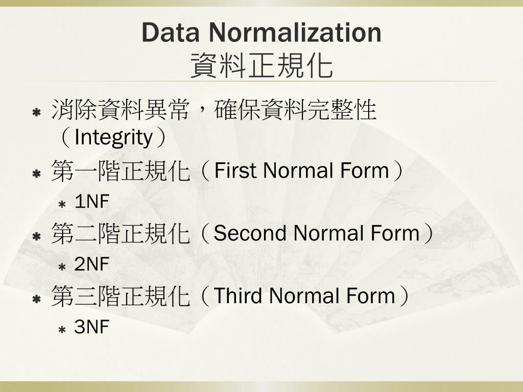 Data Normalization資料正規化 • 消除資料異常,確保資料完整性(Integrity) • 第一階正規化(First Normal Form) • 1NF • 第二階正規化(Second Normal Form) • 2NF • 第三階正規化(Third Normal Form) • 3NF
