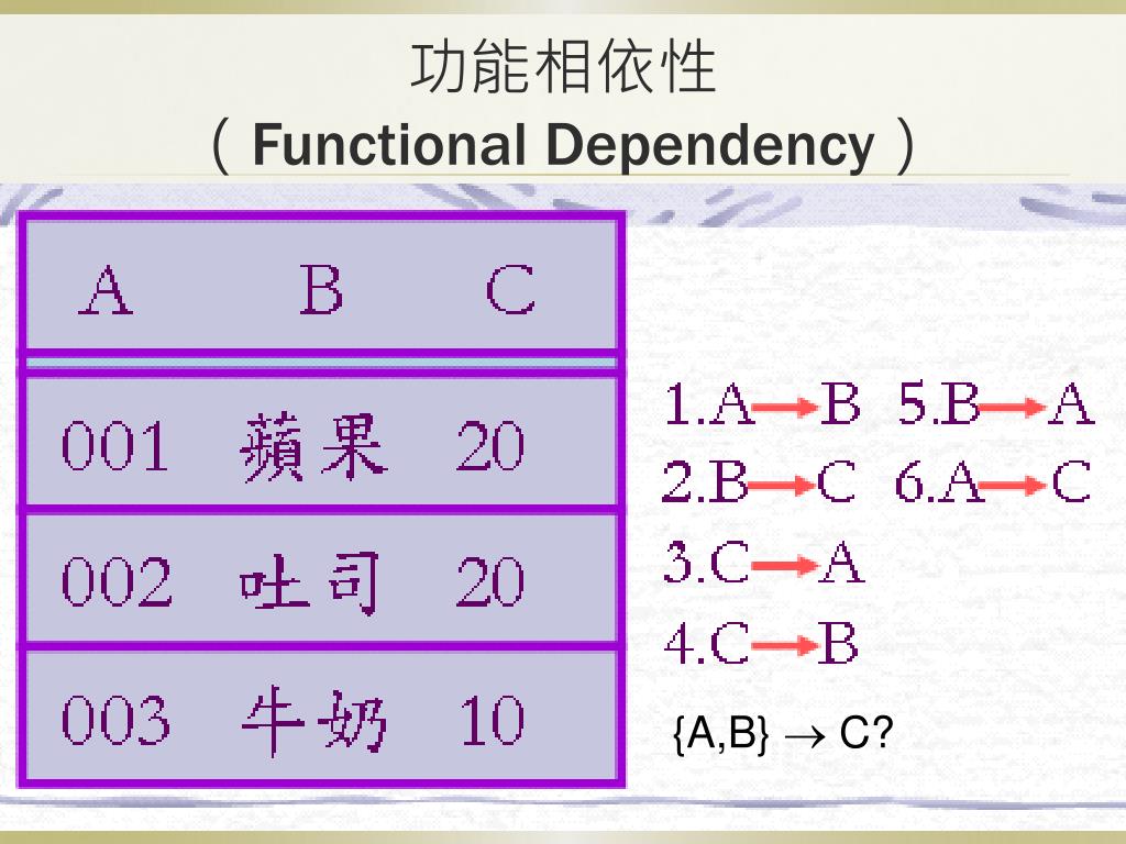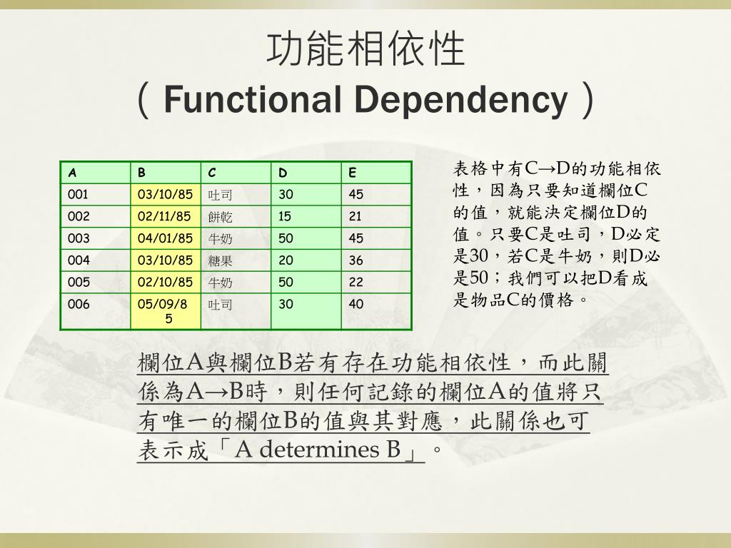 功能相依性(Functional Dependency) 表格中有C→D的功能相依性,因為只要知道欄位C的值,就能決定欄位D的值。只要C是吐司,D必定是30,若C是牛奶,則D必是50;我們可以把D看成是物品C的價格。 欄位A與欄位B若有存在功能相依性,而此關係為A→B時,則任何記錄的欄位A的值將只有唯一的欄位B的值與其對應,此關係也可表示成「A determines B」。