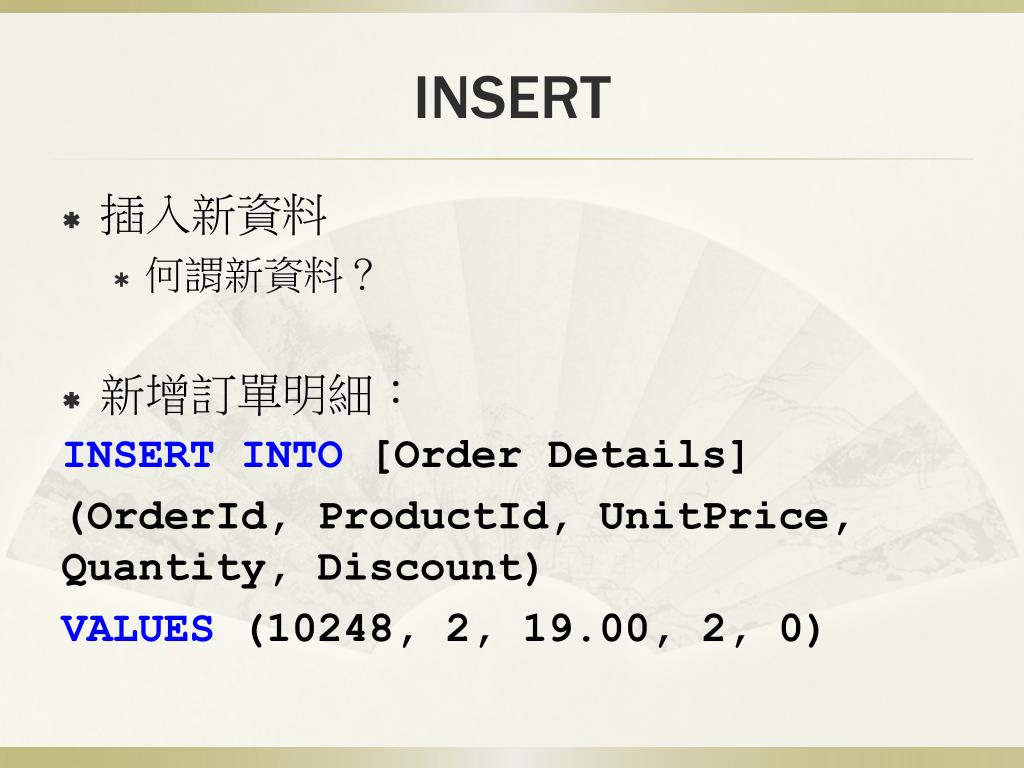 INSERT • 插入新資料 • 何謂新資料? • 新增訂單明細: INSERT INTO [Order Details] (OrderId, ProductId, UnitPrice, Quantity, Discount) VALUES (10248, 2, 19.00, 2, 0)