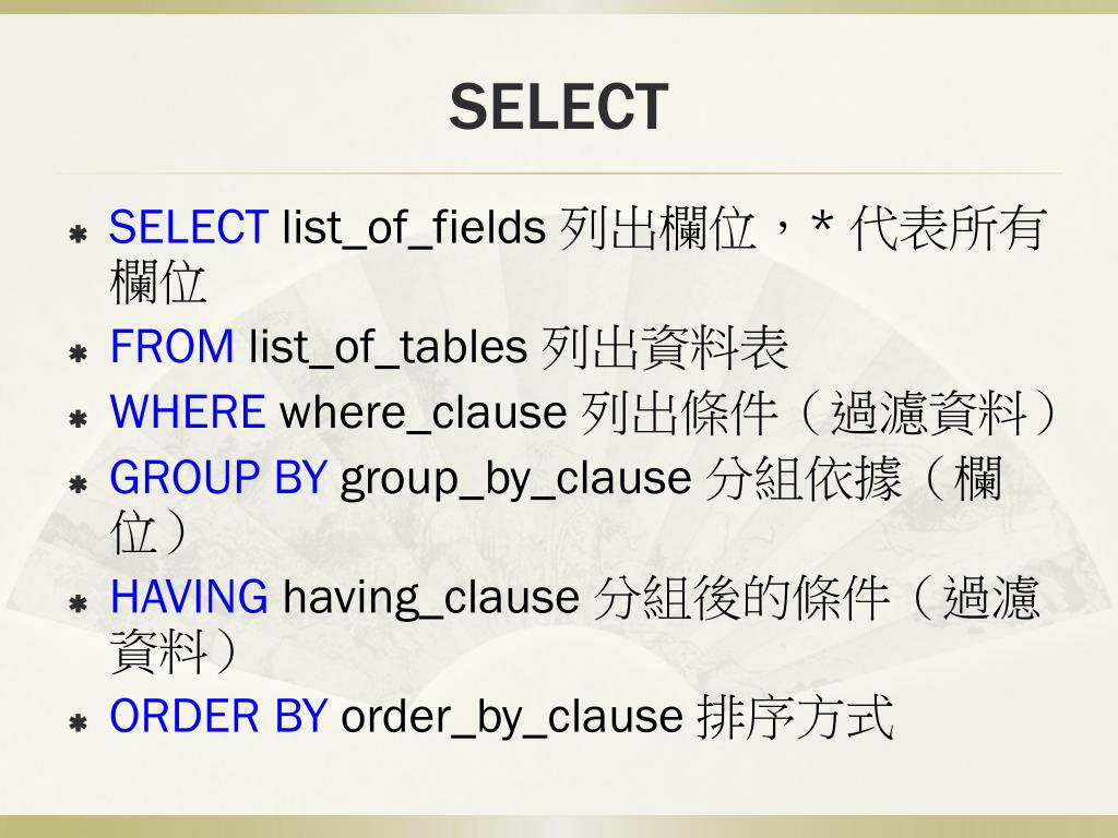 SELECT SELECTlist_of_fields列出欄位,* 代表所有欄位 FROMlist_of_tables列出資料表 WHEREwhere_clause列出條件(過濾資料) GROUP BY group_by_clause分組依據(欄位) HAVINGhaving_clause分組後的條件(過濾資料) ORDER BY order_by_clause排序方式