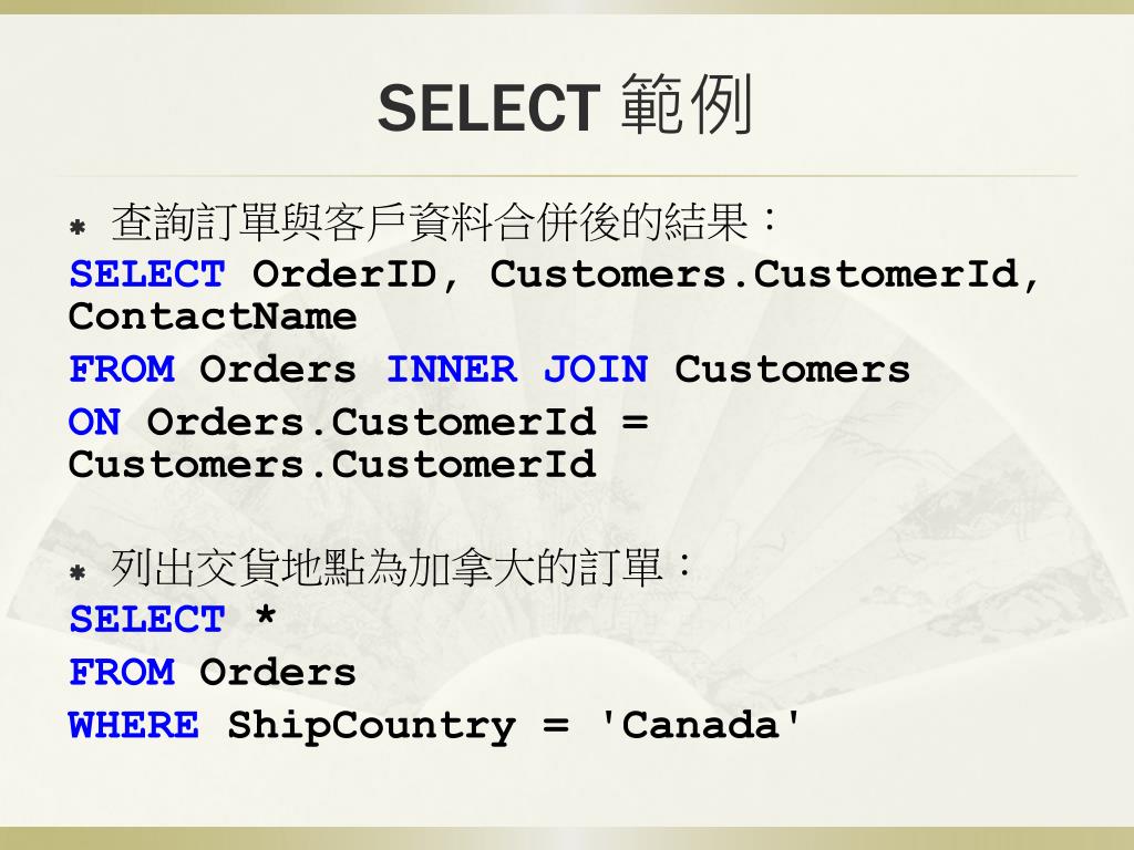 SELECT 範例 查詢訂單與客戶資料合併後的結果: SELECTOrderID, Customers.CustomerId, ContactName FROM Orders INNER JOIN Customers ONOrders.CustomerId = Customers.CustomerId 列出交貨地點為加拿大的訂單: SELECT * FROM Orders WHEREShipCountry = 'Canada'