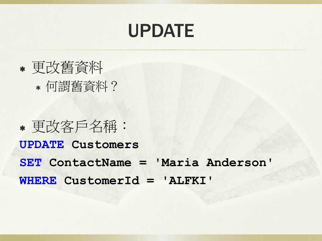UPDATE • 更改舊資料 • 何謂舊資料? • 更改客戶名稱: UPDATE Customers SETContactName = 'Maria Anderson' WHERECustomerId = 'ALFKI'