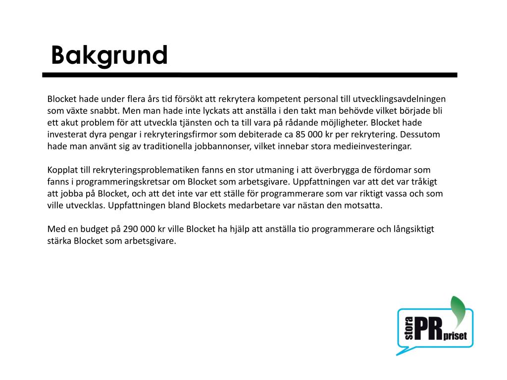 Bakgrund Blocket hade under flera års tid försökt att rekrytera kompetent personal till utvecklingsavdelningen som växte snabbt. Men man hade inte lyckats att anställa i den takt man behövde vilket började bli ett akut problem för att utveckla tjänsten och ta till vara på rådande möjligheter. Blocket hade investerat dyra pengar i rekryteringsfirmor som debiterade ca 85 000 kr per rekrytering. Dessutom hade man använt sig av traditionella jobbannonser, vilket innebar stora medieinvesteringar. Kopplat till rekryteringsproblematiken fanns en stor utmaning i att överbrygga de fördomar som fanns i programmeringskretsar om Blocket som arbetsgivare. Uppfattningen var att det var tråkigt att jobba på Blocket, och att det inte var ett ställe för programmerare som var riktigt vassa och som ville utvecklas. Uppfattningen bland Blockets medarbetare var nästan den motsatta. Med en budget på 290 000 kr ville Blocket ha hjälp att anställa tio programmerare och långsiktigt stärka Blocket som arbetsgivare.