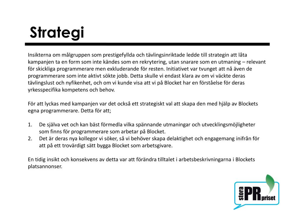 Strategi Insikterna om målgruppen som prestigefyllda och tävlingsinriktade ledde till strategin att låta kampanjen ta en form som inte kändes som en rekrytering, utan snarare som en utmaning – relevant för skickliga programmerare men exkluderande för resten. Initiativet var tvunget att nå även de programmerare som inte aktivt sökte jobb. Detta skulle vi endast klara av om vi väckte deras tävlingslust och nyfikenhet, och om vi kunde visa att vi på Blocket har en förståelse för deras yrkesspecifika kompetens och behov. För att lyckas med kampanjen var det också ett strategiskt val att skapa den med hjälp av Blockets egna programmerare. Detta för att; De själva vet och kan bäst förmedla vilka spännande utmaningar och utvecklingsmöjligheter som finns för programmerare som arbetar på Blocket. Det är deras nya kollegor vi söker, så vi behöver skapa delaktighet och engagemang inifrån för att på ett trovärdigt sätt bygga Blocket som arbetsgivare. En tidig insikt och konsekvens av detta var att förändra tilltalet i arbetsbeskrivningarna i Blockets platsannonser.