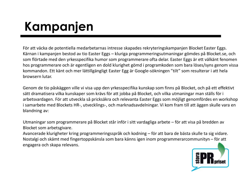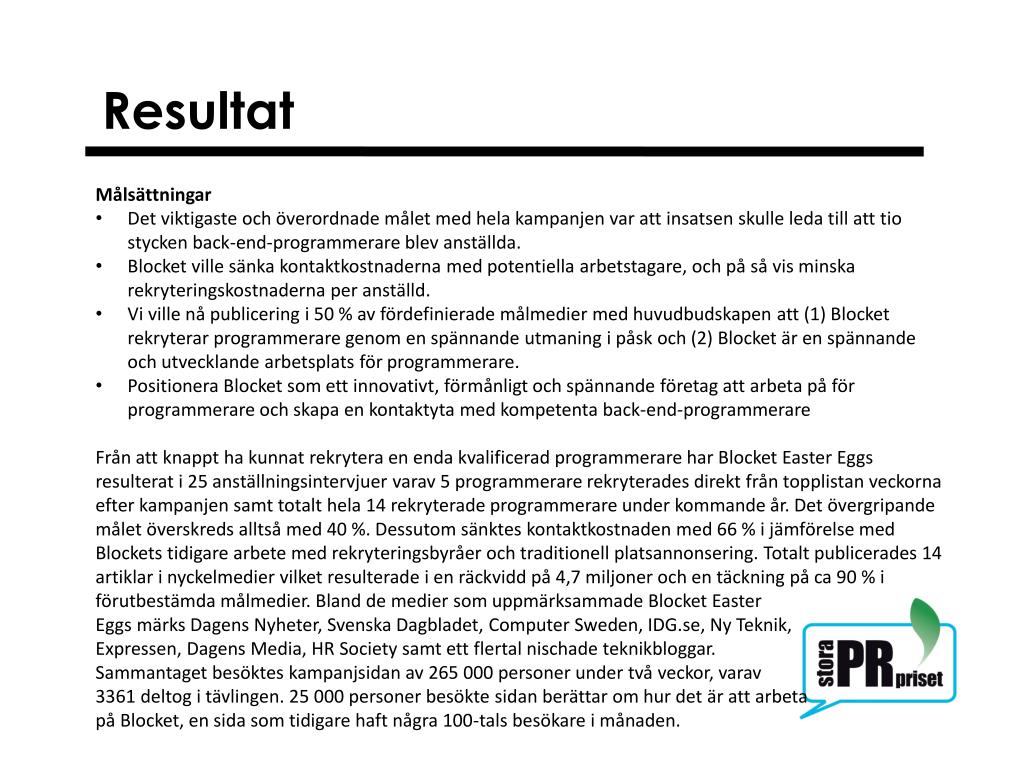 Resultat • Målsättningar • Det viktigaste och överordnade målet med hela kampanjen var att insatsen skulle leda till att tio stycken back-end-programmerare blev anställda. • Blocket ville sänka kontaktkostnaderna med potentiella arbetstagare, och på så vis minska rekryteringskostnaderna per anställd. • Vi ville nå publicering i 50 % av fördefinierade målmedier med huvudbudskapen att (1) Blocket rekryterar programmerare genom en spännande utmaning i påsk och (2) Blocket är en spännande och utvecklande arbetsplats för programmerare. • Positionera Blocket som ett innovativt, förmånligt och spännande företag att arbeta på för programmerare och skapa en kontaktyta med kompetenta back-end-programmerare • Från att knappt ha kunnat rekrytera en enda kvalificerad programmerare har Blocket Easter Eggs resulterat i 25 anställningsintervjuer varav 5 programmerare rekryterades direkt från topplistan veckorna efter kampanjen samt totalt hela 14 rekryterade programmerare under kommande år. Det övergripande målet överskreds alltså med 40 %. Dessutom sänktes kontaktkostnaden med 66 % i jämförelse med Blockets tidigare arbete med rekryteringsbyråer och traditionell platsannonsering. Totalt publicerades 14 artiklar i nyckelmedier vilket resulterade i en räckvidd på 4,7 miljoner och en täckning på ca 90 % i förutbestämda målmedier. Bland de medier som uppmärksammade Blocket Easter • Eggs märks Dagens Nyheter, Svenska Dagbladet, Computer Sweden, IDG.se, Ny Teknik, • Expressen, Dagens Media, HR Society samt ett flertal nischade teknikbloggar. • Sammantaget besöktes kampanjsidan av 265 000 personer under två veckor, varav • 3361 deltog i tävlingen. 25 000 personer besökte sidan berättar om hur det är att arbeta • på Blocket, en sida som tidigare haft några 100-tals besökare i månaden.
