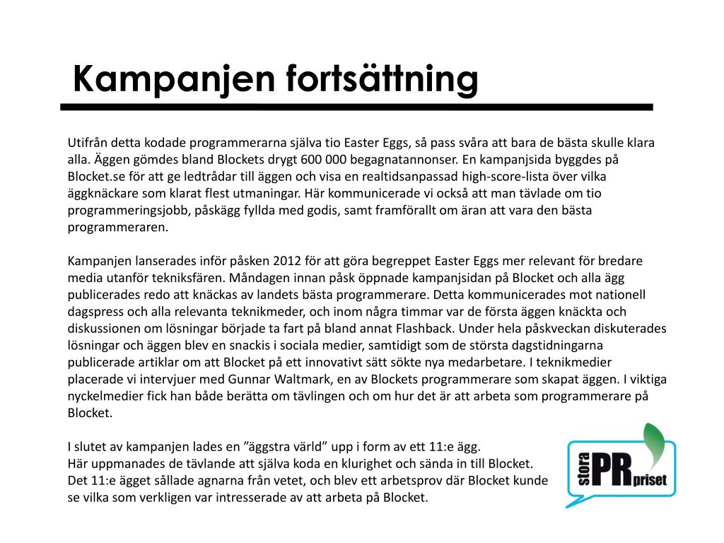 Kampanjen fortsättning Utifrån detta kodade programmerarna själva tio Easter Eggs, så pass svåra att bara de bästa skulle klara alla. Äggen gömdes bland Blockets drygt 600 000 begagnatannonser. En kampanjsida byggdes på Blocket.se för att ge ledtrådar till äggen och visa en realtidsanpassad high-score-lista över vilka äggknäckare som klarat flest utmaningar. Här kommunicerade vi också att man tävlade om tio programmeringsjobb, påskägg fyllda med godis, samt framförallt om äran att vara den bästa programmeraren. Kampanjen lanserades inför påsken 2012 för att göra begreppet Easter Eggs mer relevant för bredare media utanför tekniksfären. Måndagen innan påsk öppnade kampanjsidan på Blocket och alla ägg publicerades redo att knäckas av landets bästa programmerare. Detta kommunicerades mot nationell dagspress och alla relevanta teknikmeder, och inom några timmar var de första äggen knäckta och diskussionen om lösningar började ta fart på bland annat Flashback. Under hela påskveckan diskuterades lösningar och äggen blev en snackis i sociala medier, samtidigt som de största dagstidningarna publicerade artiklar om att Blocket på ett innovativt sätt sökte nya medarbetare. I teknikmedier placerade vi intervjuer med Gunnar Waltmark, en av Blockets programmerare som skapat äggen. I viktiga nyckelmedier fick han både berätta om tävlingen och om hur det är att arbeta som programmerare på Blocket. I slutet av kampanjen lades en ”äggstra värld” upp i form av ett 11:e ägg. Här uppmanades de tävlande att själva koda en klurighet och sända in till Blocket. Det 11:e ägget sållade agnarna från vetet, och blev ett arbetsprov där Blocket kunde se vilka som verkligen var intresserade av att arbeta på Blocket.