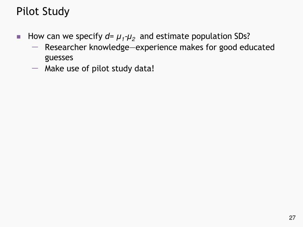 Pilot Study • How can we specify d= μ1-μ2 and estimate population SDs? • Researcher knowledge—experience makes for good educated guesses • Make use of pilot study data!