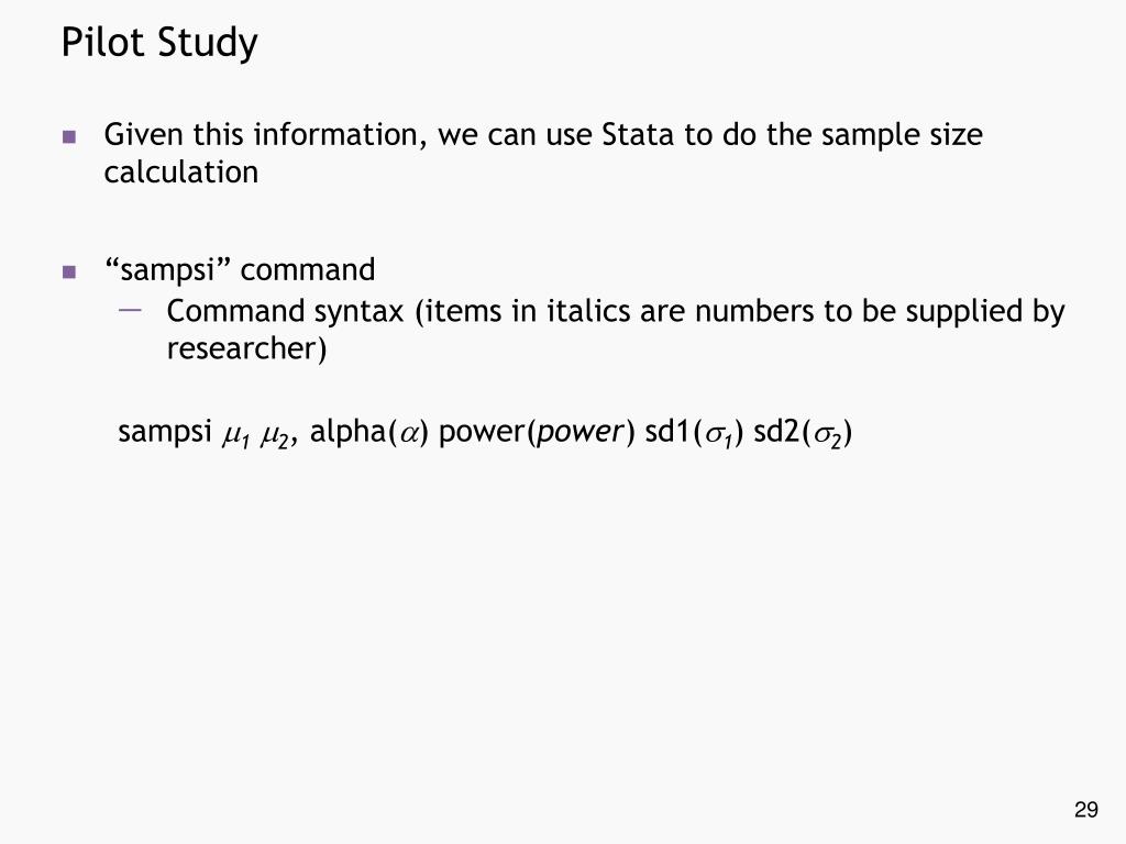 Pilot Study • Given this information, we can use Stata to do the sample size calculation • “sampsi” command • Command syntax (items in italics are numbers to be supplied by researcher) sampsi p1p2, alpha() power(power)