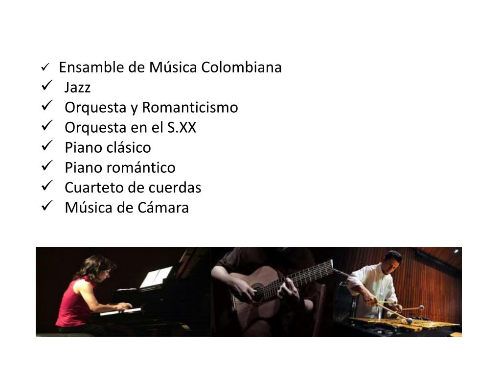 Ensamble de Música Colombiana • Jazz • Orquesta y Romanticismo • Orquesta en el S.XX • Piano clásico • Piano romántico • Cuarteto de cuerdas • Música de Cámara