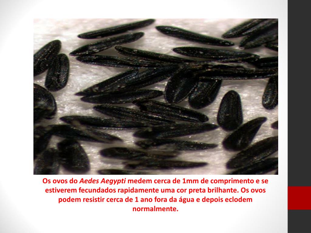 Os ovos do Aedes Aegypti medem cerca de 1mm de comprimento e se estiverem fecundados rapidamente uma cor preta brilhante. Os ovos podem resistir cerca de 1 ano fora da água e depois eclodem normalmente.