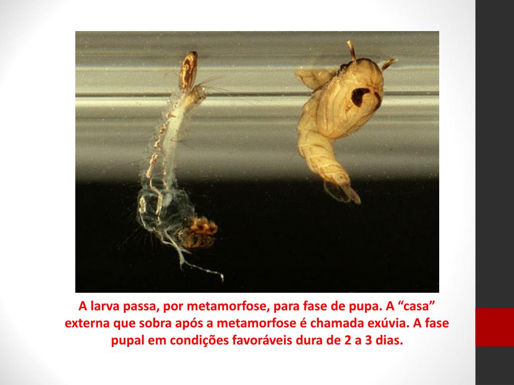 A pupa não se alimenta, apenas respira e é nessa fase que ocorre a metamorfose do estágio pupal para o mosquito adulto.