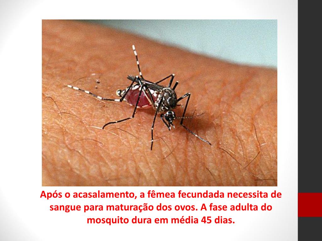 Após o acasalamento, a fêmea fecundada necessita de sangue para maturação dos ovos. A fase adulta do mosquito dura em média 45 dias.