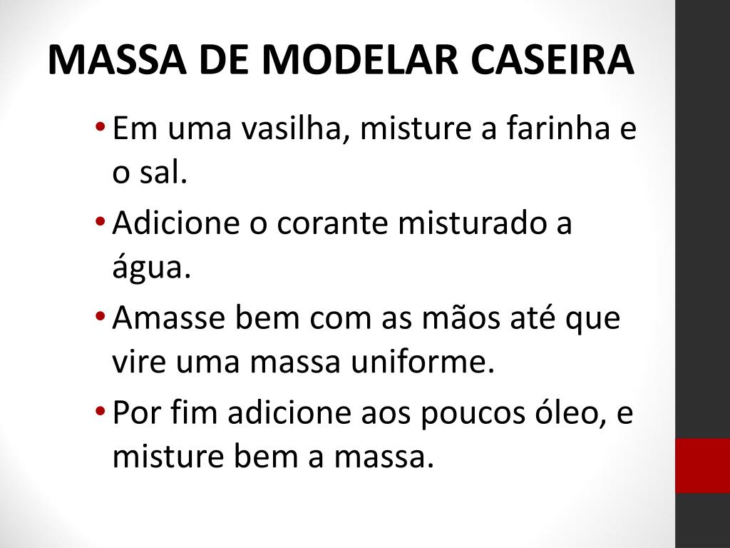 MASSA DE MODELAR CASEIRA • Em uma vasilha, misture a farinha e o sal. • Adicione o corante misturado a água. • Amasse bem com as mãos até que vire uma massa uniforme. • Por fim adicione aos poucos óleo, e misture bem a massa.