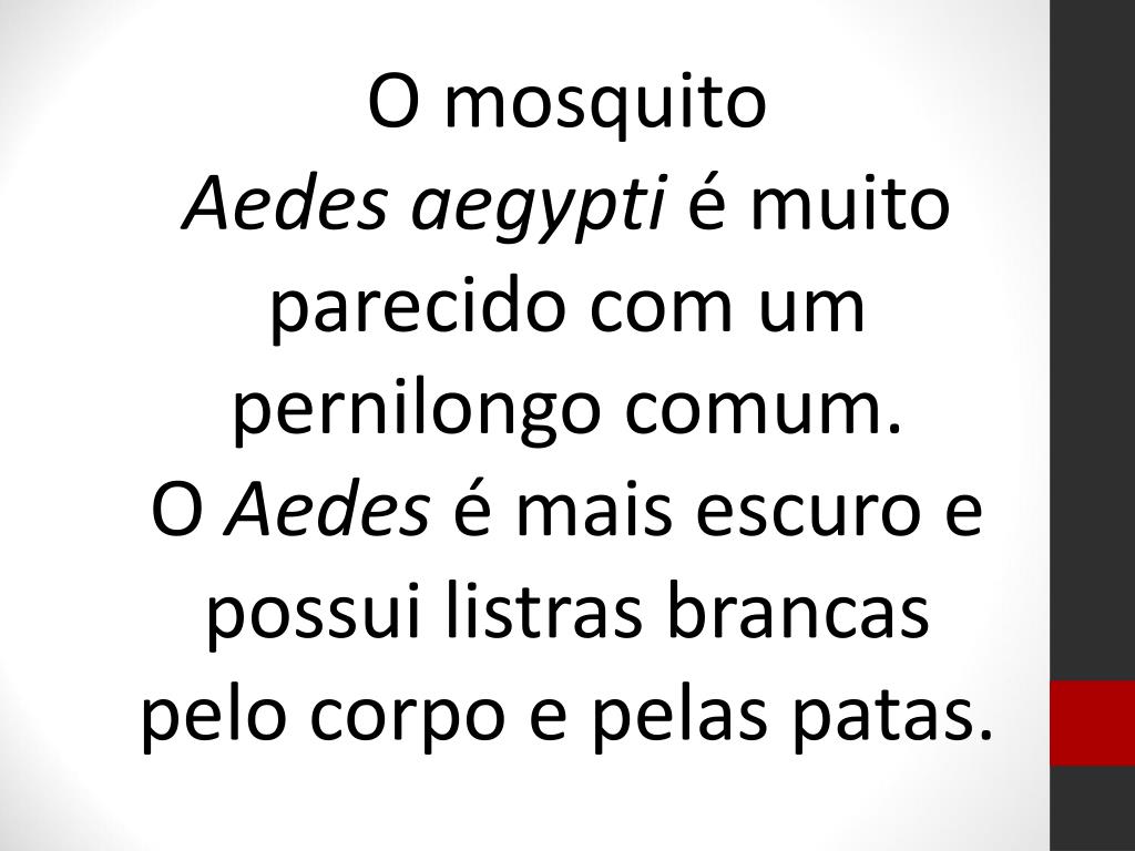 O mosquito Aedes aegypti é muito parecido com um pernilongo comum. O Aedes é mais escuro e possui listras brancas pelo corpo e pelas patas.