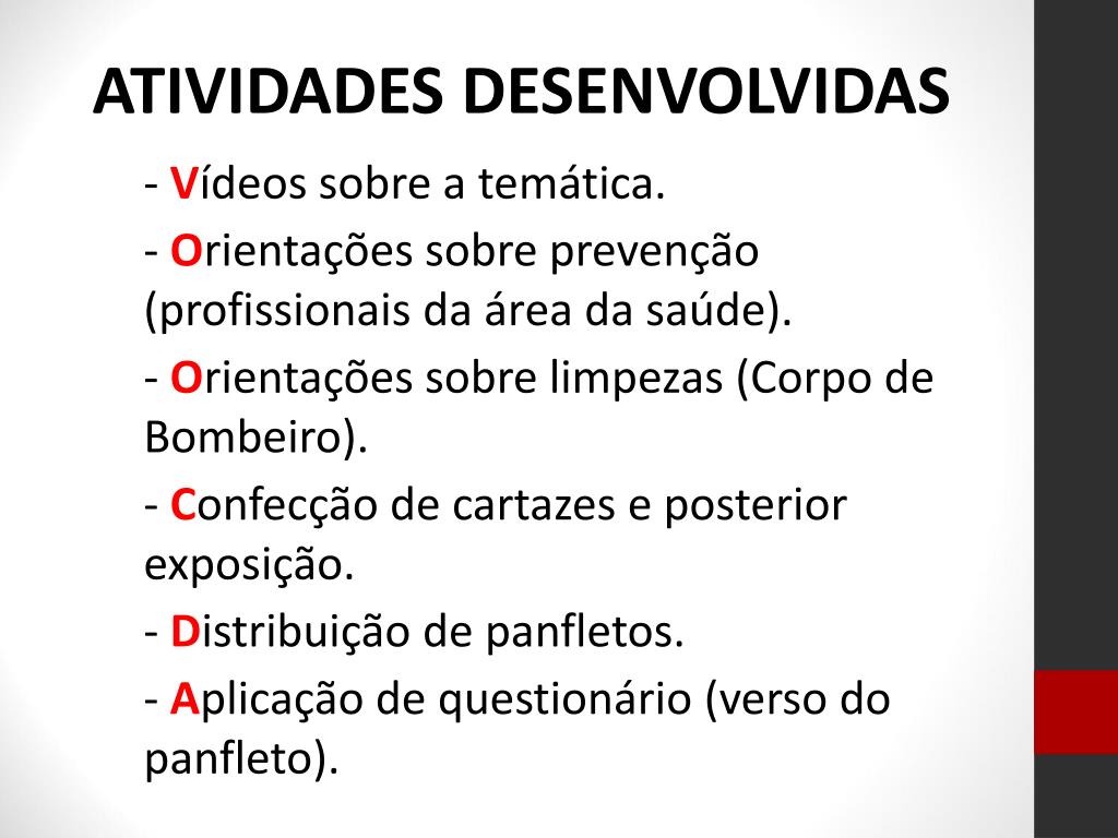 ATIVIDADES DESENVOLVIDAS - Vídeos sobre a temática. - Orientações sobre prevenção (profissionais da área da saúde). - Orientações sobre limpezas (Corpo de Bombeiro). - Confecção de cartazes e posterior exposição. - Distribuição de panfletos. - Aplicação de questionário (verso do panfleto).