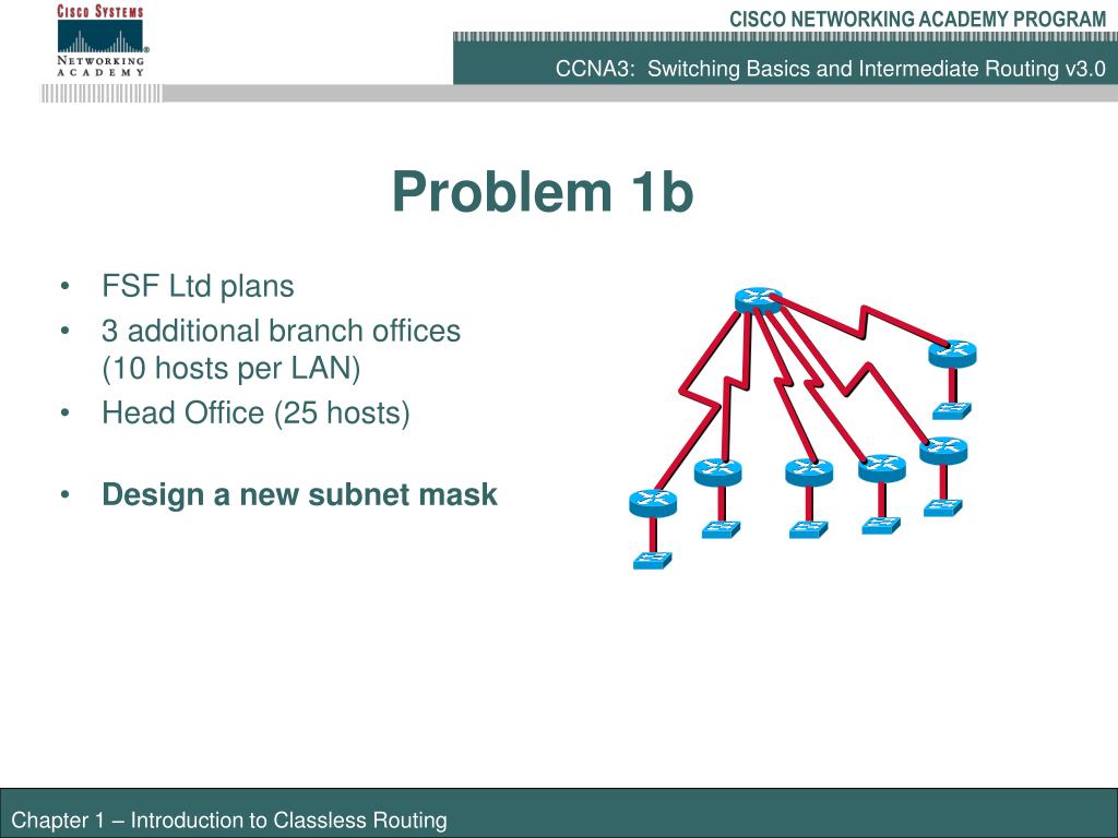 Problem 1b • FSF Ltd plans • 3 additional branch offices (10 hosts per LAN) • Head Office (25 hosts) • Design a new subnet mask