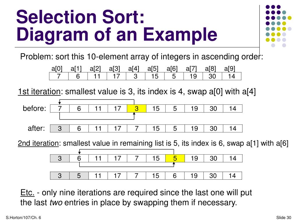 Selection Sort:Diagram of an Example Problem: sort this 10-element array of integers in ascending order: 1st iteration: smallest value is 3, its index is 4, swap a[0] with a[4] before: after: 2nd iteration: smallest value in remaining list is 5, its index is 6, swap a[1] with a[6] Etc. - only nine iterations are required since the last one will put the last two entries in place by swapping them if necessary.