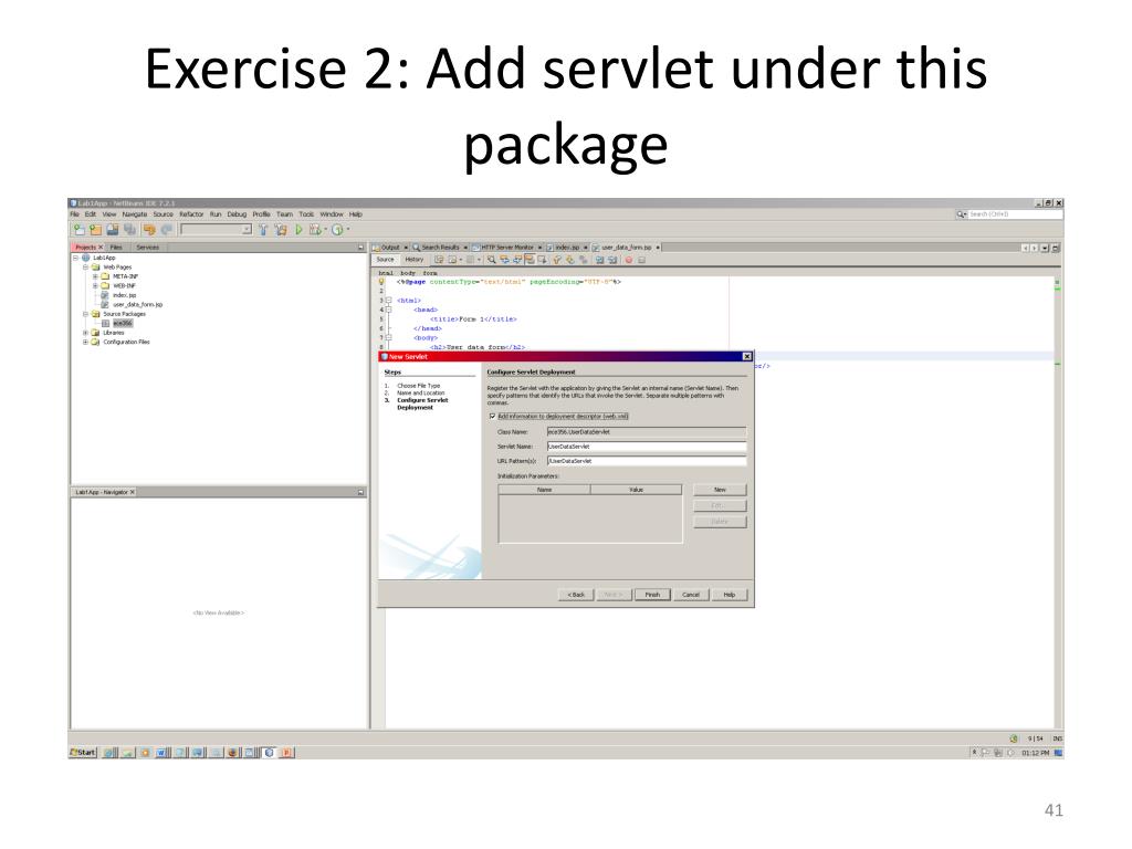 Exercise 2: Enter, save and display data • Modify this web application so that: • It will allow the user to enter some data in another JSP. The application will then display this data and save it. • You will need to: • Add several JSPs to enter and display the data entered. • Add a JavaBean class to store the data entered by the user. • Add a servlet to process, save the data entered, and display this data in subsequent JSPs.