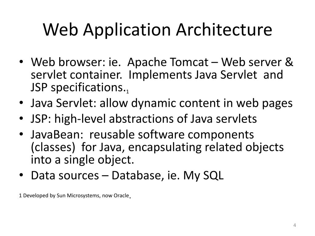 Web Application Architecture • Web browser: ie. Apache Tomcat – Web server & servlet container. Implements Java Servlet and JSP specifications.1 • Java Servlet: allow dynamic content in web pages • JSP: high-level abstractions of Java servlets • JavaBean: reusable software components (classes) for Java, encapsulating related objects into a single object. • Data sources – Database, ie. My SQL 1 Developed by Sun Microsystems, now Oracle.