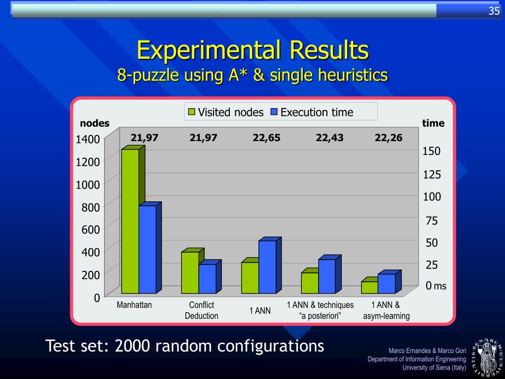 Experimental Results 8-puzzle using A* and multiple heuristics Test set: 2000 random configurations Marco Ernandes & Marco Gori Department of Information Engineering University of Siena (Italy)