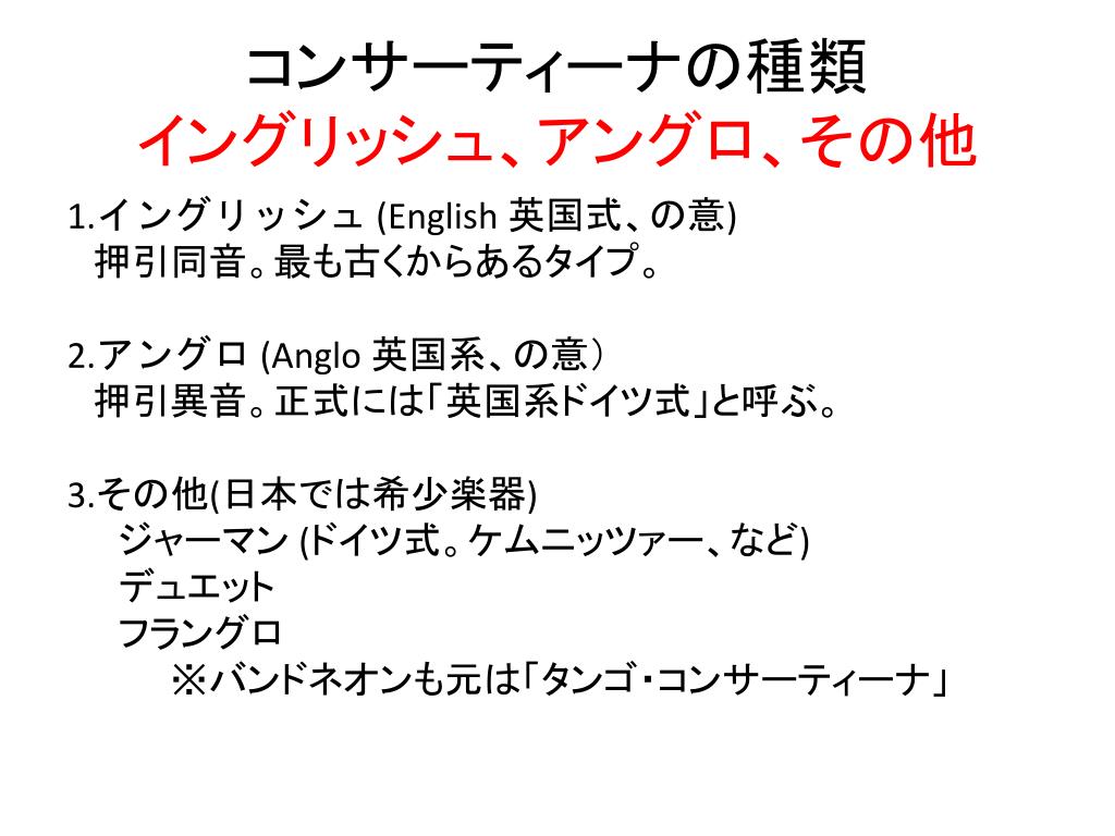 コンサーティーナの種類イングリッシュ、アングロ、その他コンサーティーナの種類イングリッシュ、アングロ、その他 1.イングリッシュ(English 英国式、の意) 押引同音。最も古くからあるタイプ。 2.アングロ(Anglo 英国系、の意) 押引異音。正式には「英国系ドイツ式」と呼ぶ。 3.その他(日本では希少楽器) ジャーマン(ドイツ式。ケムニッツァー、など) デュエット フラングロ ※バンドネオンも元は「タンゴ・コンサーティーナ」