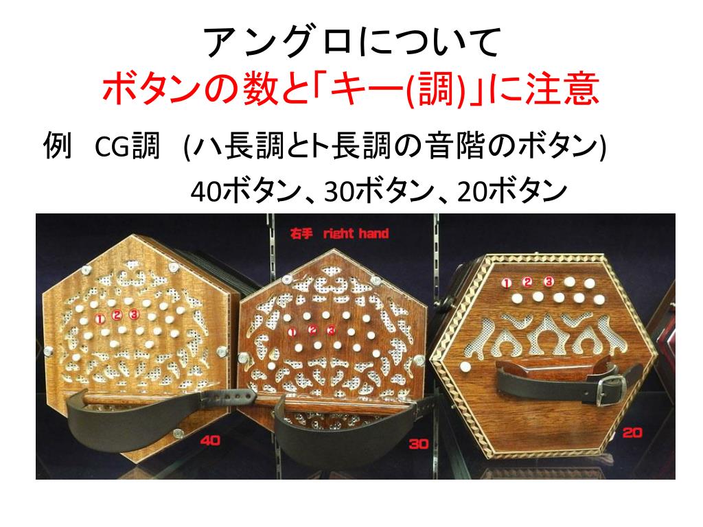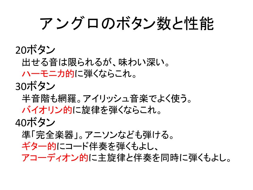 アングロのボタン数と性能 20ボタン 出せる音は限られるが、味わい深い。 ハーモニカ的に弾くならこれ。 30ボタン 半音階も網羅。アイリッシュ音楽でよく使う。 バイオリン的に旋律を弾くならこれ。 40ボタン 準「完全楽器」。アニソンなども弾ける。 ギター的にコード伴奏を弾くもよし、 アコーディオン的に主旋律と伴奏を同時に弾くもよし。