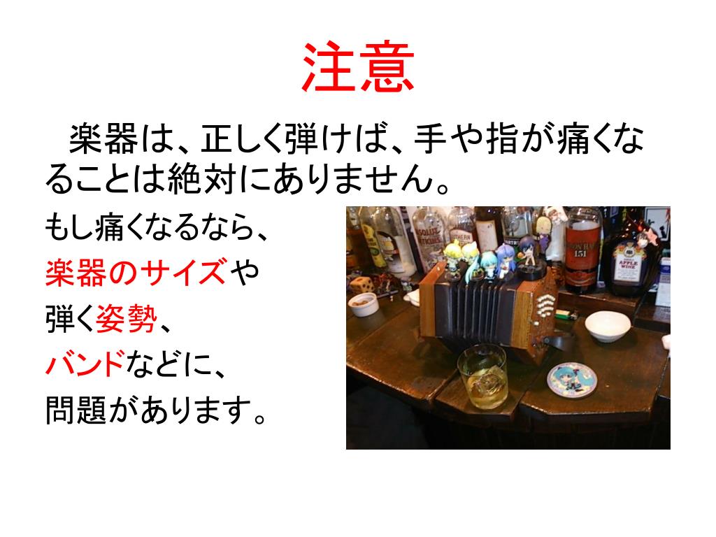 注意 楽器は、正しく弾けば、手や指が痛くなることは絶対にありません。 もし痛くなるなら、 楽器のサイズや 弾く姿勢、 バンドなどに、 問題があります。