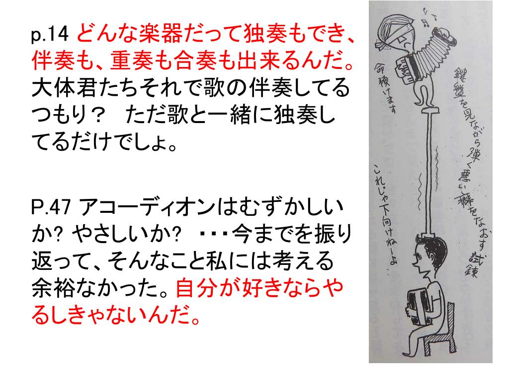 p.14 どんな楽器だって独奏もでき、伴奏も、重奏も合奏も出来るんだ。大体君たちそれで歌の伴奏してるつもり? ただ歌と一緒に独奏してるだけでしょ。 P.47 アコーディオンはむずかしいか? やさしいか? ・・・今までを振り返って、そんなこと私には考える余裕なかった。自分が好きならやるしきゃないんだ。