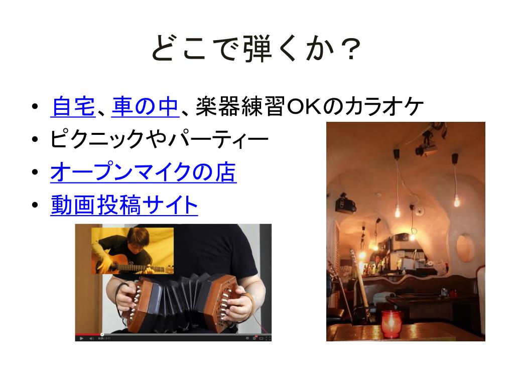 どこで弾くか? • 自宅、車の中、楽器練習OKのカラオケ • ピクニックやパーティー • オープンマイクの店 • 動画投稿サイト