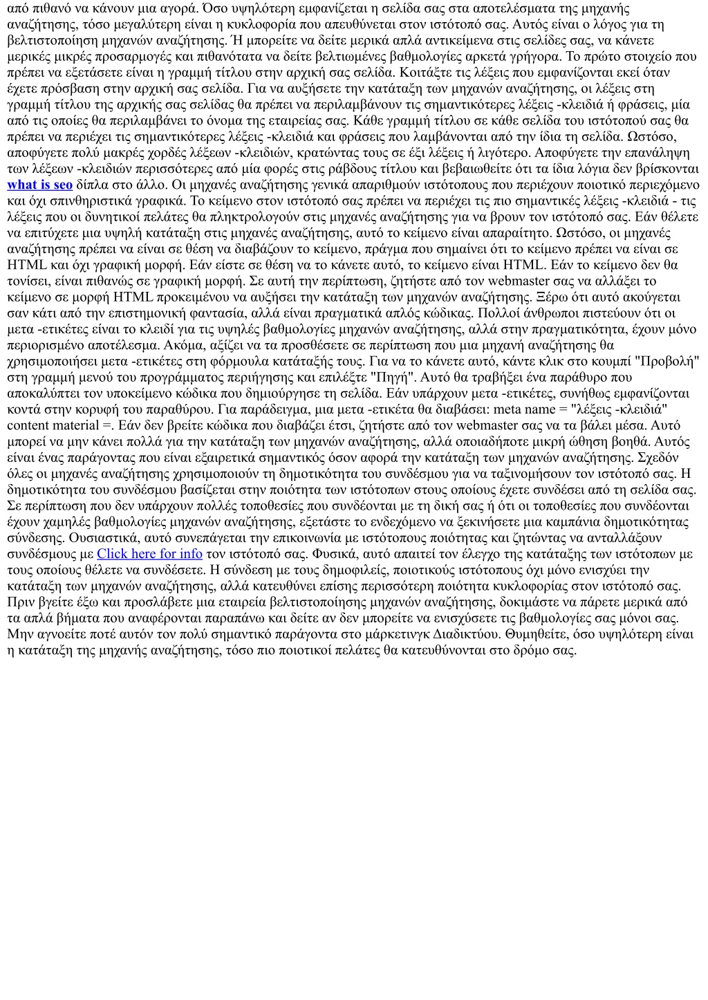 από πιθανό να κάνουν μια αγορά. Όσο υψηλότερη εμφανίζεται η σελίδα σας στα αποτελέσματα της μηχανής αναζήτησης, τόσο μεγαλύτερη είναι η κυκλοφορία που απευθύνεται στον ιστότοπό σας. Αυτός είναι ο λόγος για τη βελτιστοποίηση μηχανών αναζήτησης. Ή μπορείτε να δείτε μερικά απλά αντικείμενα στις σελίδες σας, να κάνετε μερικές μικρές προσαρμογές και πιθανότατα να δείτε βελτιωμένες βαθμολογίες αρκετά γρήγορα. Το πρώτο στοιχείο που πρέπει να εξετάσετε είναι η γραμμή τίτλου στην αρχική σας σελίδα. Κοιτάξτε τις λέξεις που εμφανίζονται εκεί όταν έχετε πρόσβαση στην αρχική σας σελίδα. Για να αυξήσετε την κατάταξη των μηχανών αναζήτησης, οι λέξεις στη γραμμή τίτλου της αρχικής σας σελίδας θα πρέπει να περιλαμβάνουν τις σημαντικότερες λέξεις -κλειδιά ή φράσεις, μία από τις οποίες θα περιλαμβάνει το όνομα της εταιρείας σας. Κάθε γραμμή τίτλου σε κάθε σελίδα του ιστότοπού σας θα πρέπει να περιέχει τις σημαντικότερες λέξεις -κλειδιά και φράσεις που λαμβάνονται από την ίδια τη σελίδα. Ωστόσο, αποφύγετε πολύ μακρές χορδές λέξεων -κλειδιών, κρατώντας τους σε έξι λέξεις ή λιγότερο. Αποφύγετε την επανάληψη των λέξεων -κλειδιών περισσότερες από μία φορές στις ράβδους τίτλου και βεβαιωθείτε ότι τα ίδια λόγια δεν βρίσκονται what is seo δίπλα στο άλλο. Οι μηχανές αναζήτησης γενικά απαριθμούν ιστότοπους που περιέχουν ποιοτικό περιεχόμενο και όχι σπινθηριστικά γραφικά. Το κείμενο στον ιστότοπό σας πρέπει να περιέχει τις πιο σημαντικές λέξεις -κλειδιά - τις λέξεις που οι δυνητικοί πελάτες θα πληκτρολογούν στις μηχανές αναζήτησης για να βρουν τον ιστότοπό σας. Εάν θέλετε να επιτύχετε μια υψηλή κατάταξη στις μηχανές αναζήτησης, αυτό το κείμενο είναι απαραίτητο. Ωστόσο, οι μηχανές αναζήτησης πρέπει να είναι σε θέση να διαβάζουν το κείμενο, πράγμα που σημαίνει ότι το κείμενο πρέπει να είναι σε HTML και όχι γραφική μορφή. Εάν είστε σε θέση να το κάνετε αυτό, το κείμενο είναι HTML. Εάν το κείμενο δεν θα τονίσει, είναι πιθανώς σε γραφική μορφή. Σε αυτή την περίπτωση, ζητήστε από τον webmaster σας να αλλάξει το κείμενο σε μορφή HTML προκειμένου να αυξήσει την κατάταξη των μηχανών αναζήτησης. Ξέρω ότι αυτό ακούγεται σαν κάτι από την επιστημονική φαντασία, αλλά είναι πραγματικά απλός κώδικας. Πολλοί άνθρωποι πιστεύουν ότι οι μετα -ετικέτες είναι το κλειδί για τις υψηλές βαθμολογίες μηχανών αναζήτησης, αλλά στην πραγματικότητα, έχουν μόνο περιορισμένο αποτέλεσμα. Ακόμα, αξίζει να τα προσθέσετε σε περίπτωση που μια μηχανή αναζήτησης θα χρησιμοποιήσει μετα -ετικέτες στη φόρμουλα κατάταξής τους. Για να το κάνετε αυτό, κάντε κλικ στο κουμπί "Προβολή" στη γραμμή μενού του προγράμματος περιήγησης και επιλέξτε "Πηγή". Αυτό θα τραβήξει ένα παράθυρο που αποκαλύπτει τον υποκείμενο κώδικα που δημιούργησε τη σελίδα. Εάν υπάρχουν μετα -ετικέτες, συνήθως εμφανίζονται κοντά στην κορυφή του παραθύρου. Για παράδειγμα, μια μετα -ετικέτα θα διαβάσει: meta name = "λέξεις -κλειδιά" content material =. Εάν δεν βρείτε κώδικα που διαβάζει έτσι, ζητήστε από τον webmaster σας να τα βάλει μέσα. Αυτό μπορεί να μην κάνει πολλά για την κατάταξη των μηχανών αναζήτησης, αλλά οποιαδήποτε μικρή ώθηση βοηθά. Αυτός είναι ένας παράγοντας που είναι εξαιρετικά σημαντικός όσον αφορά την κατάταξη των μηχανών αναζήτησης. Σχεδόν όλες οι μηχανές αναζήτησης χρησιμοποιούν τη δημοτικότητα του συνδέσμου για να ταξινομήσουν τον ιστότοπό σας. Η δ