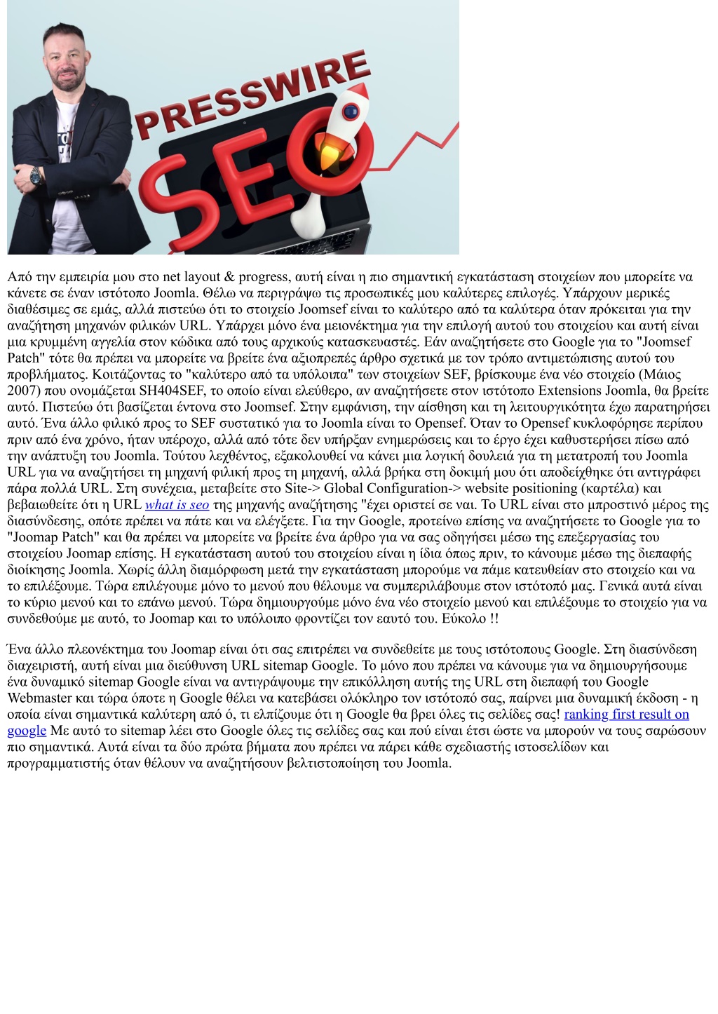 Από την εμπειρία μου στο net layout & progress, αυτή είναι η πιο σημαντική εγκατάσταση στοιχείων που μπορείτε να κάνετε σε έναν ιστότοπο Joomla. Θέλω να περιγράψω τις προσωπικές μου καλύτερες επιλογές. Υπάρχουν μερικές διαθέσιμες σε εμάς, αλλά πιστεύω ότι το στοιχείο Joomsef είναι το καλύτερο από τα καλύτερα όταν πρόκειται για την αναζήτηση μηχανών φιλικών URL. Υπάρχει μόνο ένα μειονέκτημα για την επιλογή αυτού του στοιχείου και αυτή είναι μια κρυμμένη αγγελία στον κώδικα από τους αρχικούς κατασκευαστές. Εάν αναζητήσετε στο Google για το "Joomsef Patch" τότε θα πρέπει να μπορείτε να βρείτε ένα αξιοπρεπές άρθρο σχετικά με τον τρόπο αντιμετώπισης αυτού του προβλήματος. Κοιτάζοντας το "καλύτερο από τα υπόλοιπα" των στοιχείων SEF, βρίσκουμε ένα νέο στοιχείο (Μάιος 2007) που ονομάζεται SH404SEF, το οποίο είναι ελεύθερο, αν αναζητήσετε στον ιστότοπο Extensions Joomla, θα βρείτε αυτό. Πιστεύω ότι βασίζεται έντονα στο Joomsef. Στην εμφάνιση, την αίσθηση και τη λειτουργικότητα έχω παρατηρήσει αυτό. Ένα άλλο φιλικό προς το SEF συστατικό για το Joomla είναι το Opensef. Όταν το Opensef κυκλοφόρησε περίπου πριν από ένα χρόνο, ήταν υπέροχο, αλλά από τότε δεν υπήρξαν ενημερώσεις και το έργο έχει καθυστερήσει πίσω από την ανάπτυξη του Joomla. Τούτου λεχθέντος, εξακολουθεί να κάνει μια λογική δουλειά για τη μετατροπή του Joomla URL για να αναζητήσει τη μηχανή φιλική προς τη μηχανή, αλλά βρήκα στη δοκιμή μου ότι αποδείχθηκε ότι αντιγράφει πάρα πολλά URL. Στη συνέχεια, μεταβείτε στο Site-> Global Configuration-> website positioning (καρτέλα) και βεβαιωθείτε ότι η URL what is seo της μηχανής αναζήτησης "έχει οριστεί σε ναι. Το URL είναι στο μπροστινό μέρος της διασύνδεσης, οπότε πρέπει να πάτε και να ελέγξετε. Για την Google, προτείνω επίσης να αναζητήσετε το Google για το "Joomap Patch" και θα πρέπει να μπορείτε να βρείτε ένα άρθρο για να σας οδηγήσει μέσω της επεξεργασίας του στοιχείου Joomap επίσης. Η εγκατάσταση αυτού του στοιχείου είναι η ίδια όπως πριν, το κάνουμε μέσω της διεπαφής διοίκησης Joomla. Χωρίς άλλη διαμόρφωση μετά την εγκατάσταση μπορούμε να πάμε κατευθείαν στο στοιχείο και να το επιλέξουμε. Τώρα επιλέγουμε μόνο το μενού που θέλουμε να συμπεριλάβουμε στον ιστότοπό μας. Γενικά αυτά είναι το κύριο μενού και το επάνω μενού. Τώρα δημιουργούμε μόνο ένα νέο στοιχείο μενού και επιλέξουμε το στοιχείο για να συνδεθούμε με αυτό, το Joomap και το υπόλοιπο φροντίζει τον εαυτό του. Εύκολο !! Ένα άλλο πλεονέκτημα του Joomap είναι ότι σας επιτρέπει να συνδεθείτε με τους ιστότοπους Google. Στη διασύνδεση διαχειριστή, αυτή είναι μια διεύθυνση URL sitemap Google. Το μόνο που πρέπει να κάνουμε για να δημιουργήσουμε ένα δυναμικό sitemap Google είναι να αντιγράψουμε την επικόλληση αυτής της URL στη διεπαφή του Google Webmaster και τώρα όποτε η Google θέλει να κατεβάσει ολόκληρο τον ιστότοπό σας, παίρνει μια δυναμική έκδοση - η οποία είναι σημαντικά καλύτερη από ό, τι ελπίζουμε ότι η Google θα βρει όλες τις σελίδες σας! ranking first result on google Με αυτό το sitemap λέει στο Google όλες τις σελίδες σας και πού είναι έτσι ώστε να μπορούν να τους σαρώσουν πιο σημαντικά. Αυτά είναι τα δύο πρώτα βήματα που πρέπει να πάρει κάθε σχεδιαστής ιστοσελίδων και προγραμματιστής όταν θέλουν να αναζητήσουν βελτιστοποίηση του Joomla.