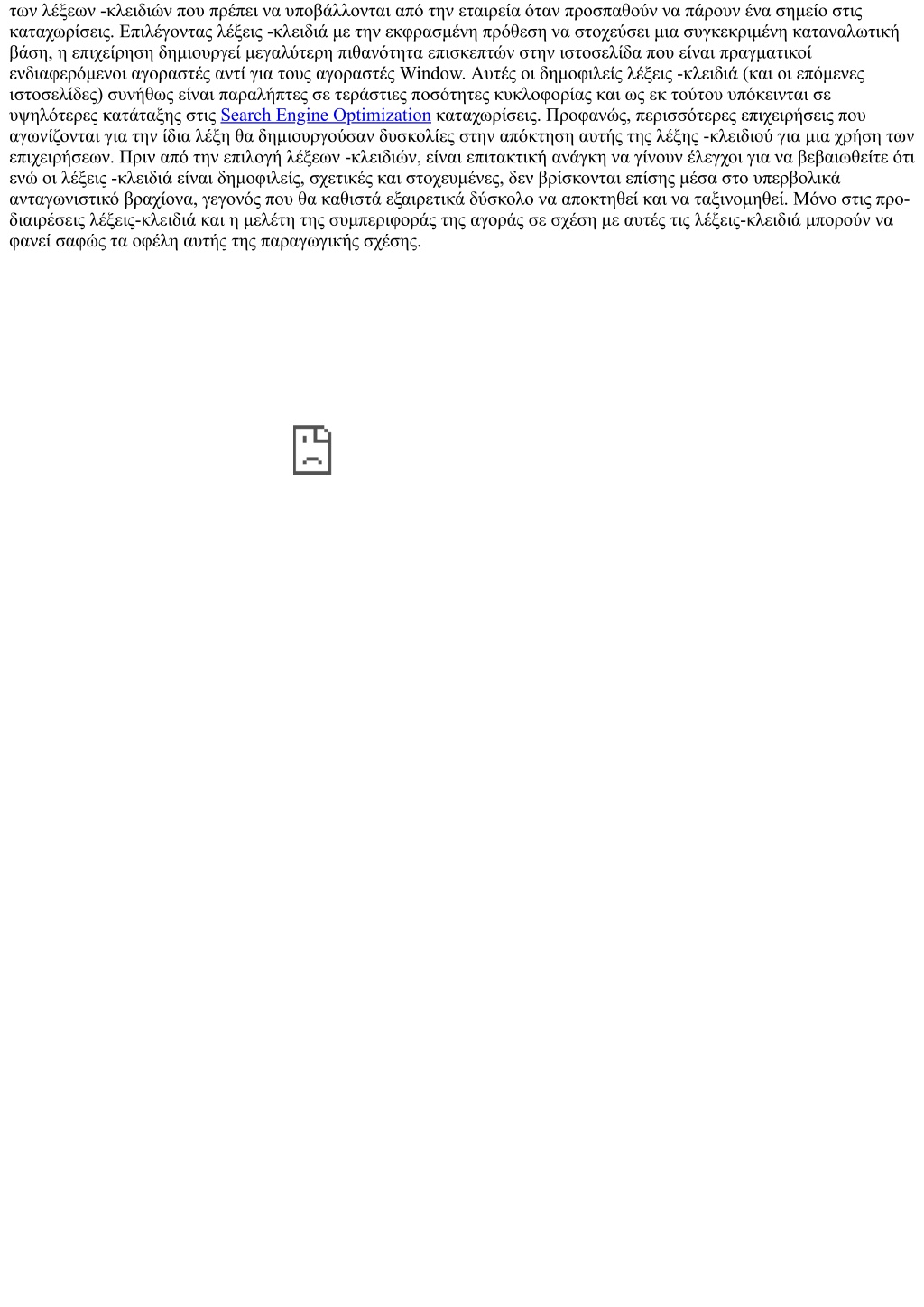 των λέξεων -κλειδιών που πρέπει να υποβάλλονται από την εταιρεία όταν προσπαθούν να πάρουν ένα σημείο στις καταχωρίσεις. Επιλέγοντας λέξεις -κλειδιά με την εκφρασμένη πρόθεση να στοχεύσει μια συγκεκριμένη καταναλωτική βάση, η επιχείρηση δημιουργεί μεγαλύτερη πιθανότητα επισκεπτών στην ιστοσελίδα που είναι πραγματικοί ενδιαφερόμενοι αγοραστές αντί για τους αγοραστές Window. Αυτές οι δημοφιλείς λέξεις -κλειδιά (και οι επόμενες ιστοσελίδες) συνήθως είναι παραλήπτες σε τεράστιες ποσότητες κυκλοφορίας και ως εκ τούτου υπόκεινται σε υψηλότερες κατάταξης στις Search Engine Optimization καταχωρίσεις. Προφανώς, περισσότερες επιχειρήσεις που αγωνίζονται για την ίδια λέξη θα δημιουργούσαν δυσκολίες στην απόκτηση αυτής της λέξης -κλειδιού για μια χρήση των επιχειρήσεων. Πριν από την επιλογή λέξεων -κλειδιών, είναι επιτακτική ανάγκη να γίνουν έλεγχοι για να βεβαιωθείτε ότι ενώ οι λέξεις -κλειδιά είναι δημοφιλείς, σχετικές και στοχευμένες, δεν βρίσκονται επίσης μέσα στο υπερβολικά ανταγωνιστικό βραχίονα, γεγονός που θα καθιστά εξαιρετικά δύσκολο να αποκτηθεί και να ταξινομηθεί. Μόνο στις προ- διαιρέσεις λέξεις-κλειδιά και η μελέτη της συμπεριφοράς της αγοράς σε σχέση με αυτές τις λέξεις-κλειδιά μπορούν να φανεί σαφώς τα οφέλη αυτής της παραγωγικής σχέσης.
