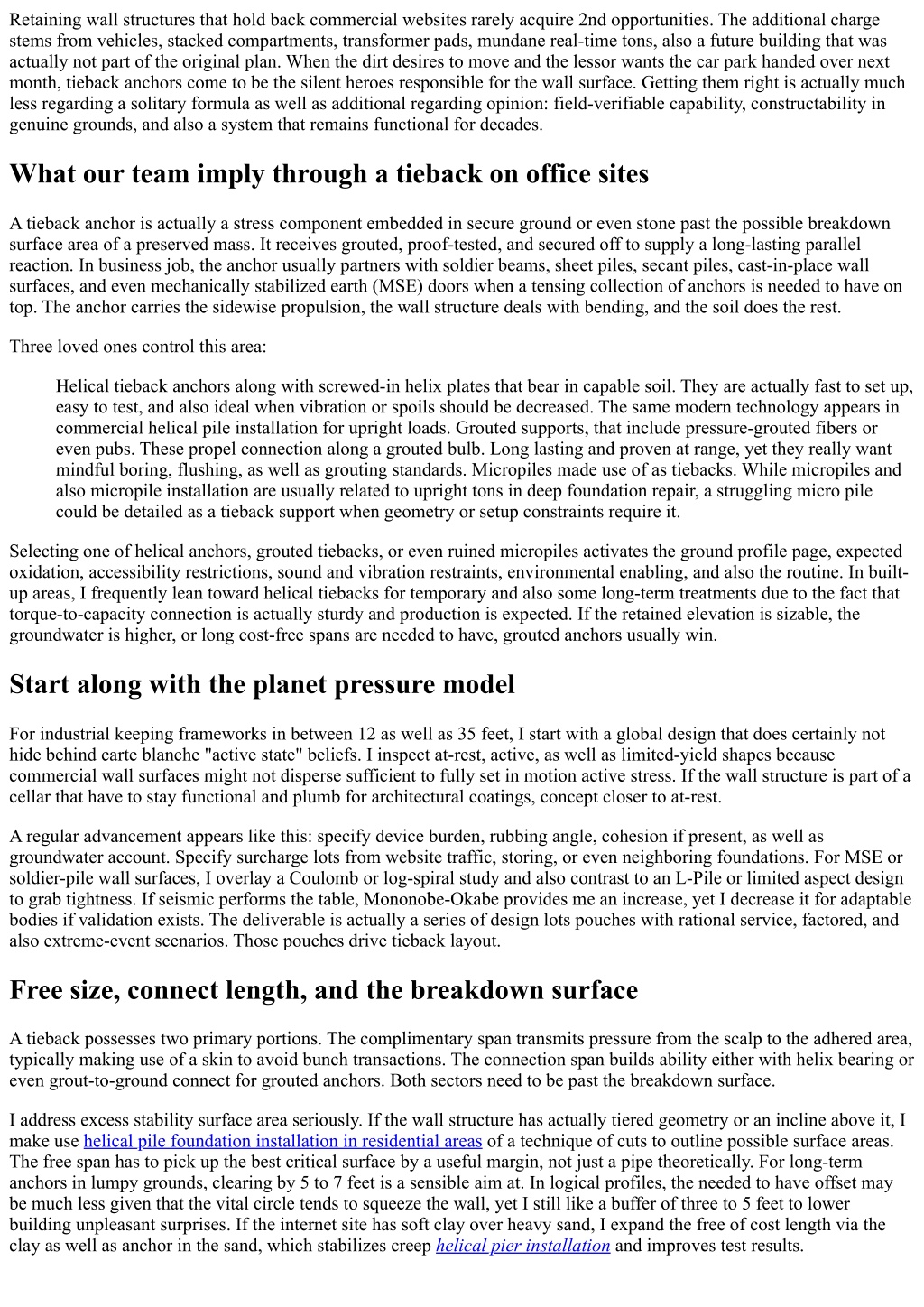 Retaining wall structures that hold back commercial websites rarely acquire 2nd opportunities. The additional charge stems from vehicles, stacked compartments, transformer pads, mundane real-time tons, also a future building that was actually not part of the original plan. When the dirt desires to move and the lessor wants the car park handed over next month, tieback anchors come to be the silent heroes responsible for the wall surface. Getting them right is actually much less regarding a solitary formula as well as additional regarding opinion: field-verifiable capability, constructability in genuine grounds, and also a system that remains functional for decades. What our team imply through a tieback on office sites A tieback anchor is actually a stress component embedded in secure ground or even stone past the possible breakdown surface area of a preserved mass. It receives grouted, proof-tested, and secured off to supply a long-lasting parallel reaction. In business job, the anchor usually partners with soldier beams, sheet piles, secant piles, cast-in-place wall surfaces, and even mechanically stabilized earth (MSE) doors when a tensing collection of anchors is needed to have on top. The anchor carries the sidewise propulsion, the wall structure deals with bending, and the soil does the rest. Three loved ones control this area: Helical tieback anchors along with screwed-in helix plates that bear in capable soil. They are actually fast to set up, easy to test, and also ideal when vibration or spoils should be decreased. The same modern technology appears in commercial helical pile installation for upright loads. Grouted supports, that include pressure-grouted fibers or even pubs. These propel connection along a grouted bulb. Long lasting and proven at range, yet they really want mindful boring, flushing, as well as grouting standards. Micropiles made use of as tiebacks. While micropiles and also micropile installation are usually related to upright tons in deep foundation repair, a struggling micro pile could be detailed as a tieback support when geometry or setup constraints require it. Selecting one of helical anchors, grouted tiebacks, or even ruined micropiles activates the ground profile page, expected oxidation, accessibility restrictions, sound and vibration restraints, environmental enabling, and also the routine. In built- up areas, I frequently lean toward helical tiebacks for temporary and also some long-term treatments due to the fact that torque-to-capacity connection is actually sturdy and production is expected. If the retained elevation is sizable, the groundwater is higher, or long cost-free spans are needed to have, grouted anchors usually win. Start along with the planet pressure model For industrial keeping frameworks in between 12 as well as 35 feet, I start with a global design that does certainly not hide behind carte blanche "active state" beliefs. I inspect at-rest, active, as well as limited-yield shapes because commercial wall surfaces might not disperse sufficient to fully set in motion active stress. If the wall structure is part of a cellar that have to stay functional and plumb for architectural coatings, concept closer to at-rest. A regular advancement appears like this: specify device burden, rubbing angle, cohesion if present, as well as groundwater account. Specify surcharge lots from website traffic, storing, or even neighboring foundations. For MSE or soldier-pile wall surfaces, I overlay a Coulomb or log-spiral study and also contrast to an L-Pile or limited aspect design to grab tightness. If seismic performs the table, Mononobe-Okabe provides me an increase, yet I decrease it for adaptable bodies if validation exists. The deliverable is actually a series of design lots pouches with rational service, factored, and also extreme-event scenarios. Those pouches drive tieback layout. Free size, connect length, and the breakdown surface A tieback possesses two primary portions. The complimentary span transmits pressure from the scalp to the adhered area, typically making use of a skin to avoid bunch transactions. The connection span builds ability either with helix bearing or even grout-to-ground connect for grouted anchors. Both sectors need to be past the breakdown surface. I address excess stability surface area seriously. If the wall structure has actually tiered geometry or an incline above it, I make use helical pile foundation installation in residential areas of a technique of cuts to outline possible surface areas. The free span has to pick up the best critical surface by a useful margin, not just a pipe theoretically. For long-term anchors in lumpy grounds, clearing by 5 to 7 feet is a sensible aim at. In logical profiles, the needed to have offset may be much less given that the vital circle tends to squeeze the wall, yet I still like a buffer of three to 5 feet to lower building unpleasant surprises. If the internet site has soft clay over heavy sand, I expand the free of cost length via the clay as well as anchor in the sand, which stabilizes creep helical pier installation and improves test results.